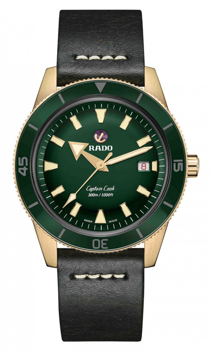 庫克船長系列是RADO雷達表近年能見度頗高的潛水錶代表作,目前這系列款式相當豐富,除了不同面盤顏色、搭配不同錶帶,也還有錶徑較小、更適合女生佩戴的版本,不過這款錶到了2020年有個重大突破就是跳脫不鏽鋼錶殼的框架,延伸出青銅錶殼款式。目前庫克船長系列採用青銅錶殼的手錶一律都是42mm款式,有的搭配NA TO錶帶,有的搭配皮錶帶,而且還有綠面、藍面與咖啡色面盤等三色,其中綠色面盤又是其中較早推出的作品,話題色彩結合青銅這個讓人眼睛一亮的材質,使得這款庫克船長潛水錶成為品牌2020年最讓人印象深刻的作品之一。
