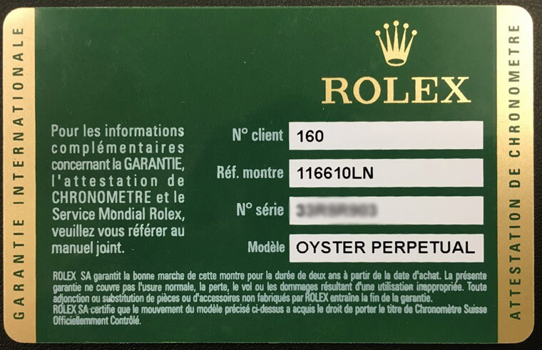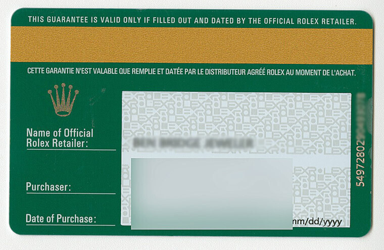 2 第二代保卡:大概在2015年推出,這代的保卡樣式更簡潔,正面僅有錶殼流水號與型號兩個欄位(部分國家會加上面盤及錶帶樣式)。此外,配色也與第一代保卡不同。二代保卡背面由上而下分別是經銷商名稱(右上角為經銷商所在的國碼)、購買者姓名與購買日期。消費者購錶當下,店家會立即「刷卡」讀取最上方的磁條,錶款訊息及當天日期會透過電腦連線傳送給ROLEX官方,五年保固即刻生效。