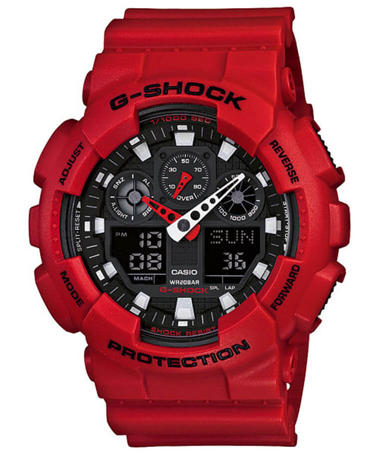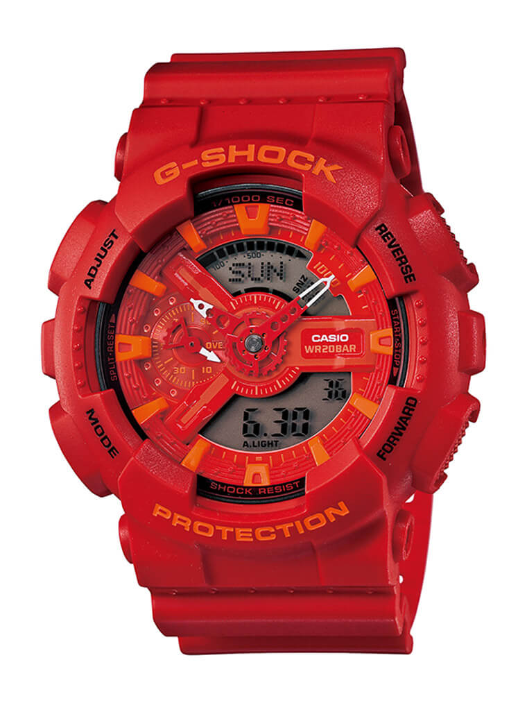 GA-110系系列擁有大錶殼尺寸和多層次錶面設計,例如搭載LCD數位顯示和重機裝置造型的指針雙顯功能,其中這款包括面盤和指針都紅成一片,不過還好指針的尖端有用白色勾勒,不至於讓人看不清時間。另外面盤的數位顯示部分顯示出日期與星期等萬年曆資訊,功能與實用性還是保有G-SHOCK的正常水準。錶款尺寸55x51.2mm,防水200米,日幣定價:16,500(台灣未發售此款全紅配色)。