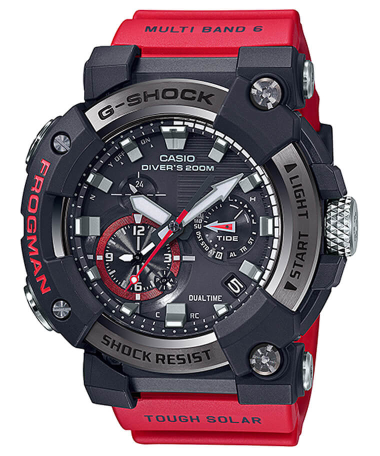 隸屬於Master of G系列的Frogman蛙人錶主打ISO 200米潛水級防水,此顏色是2020年下半年才推出的新款,錶款的亮點在於它是GWF-A1000系列首見採用指針顯示的設計,不過比起前面提到的幾款錶,GWF-A1000-1A4JF的紅色算是比較點到為止,僅面盤和錶殼上的局部細節有紅色,另外樹脂錶帶才是整片都紅色,手錶除了專業機能之外,還擁有電波接收功能、兩地時間、計時碼錶、鬧鐘、萬年曆等豐富功能,甚至還能啟動潛水模式以測量潛水經過時間與水面休息時間。錶款尺寸56.7x53.3mm,防水200米,日幣定價:99,000(台灣考價為NT$ 25,000)。