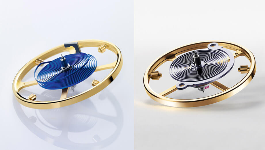 在分析這個問題前,先來簡單了解一下這兩種游絲的特性。Parachrom藍游絲的成分為鈮(niobium)、鋯(zirconium)與氧合金,相較錶壇常用的Nivarox游絲在抗磁和抗溫差等效果上均有更佳的表現,這種游絲的造型採用末端上繞的雙層游絲,游絲末端會被固定在游絲樁上。