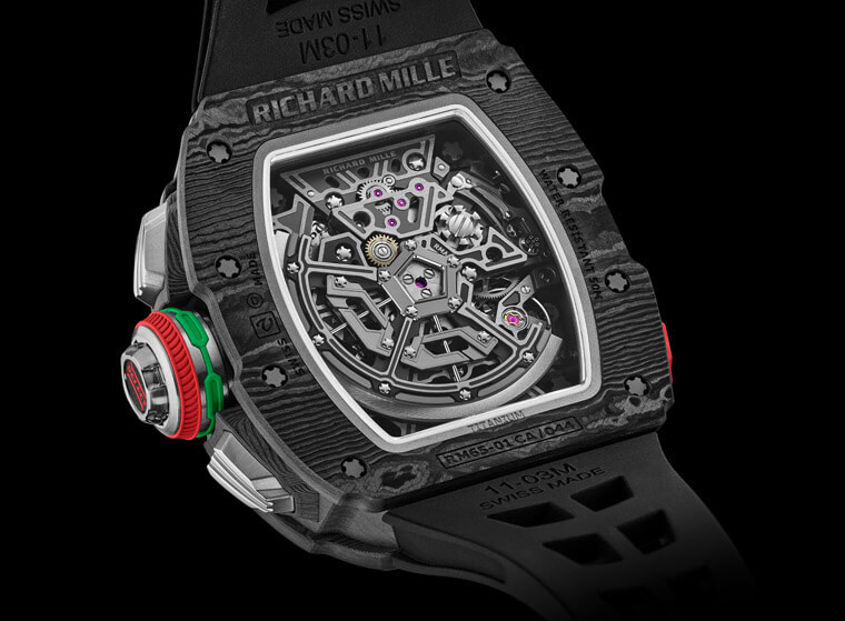 據說RM 65-01共花了RICHARD MILLE五年時間才順利開發完成,先從它的外觀談起,錶款有Carbon TPT®碳纖維以及紅金搭配Carbon TPT®碳纖維等錶殼材質組合,錶殼每一面都可以看到品牌講究的細節處理。以碳纖維款為例,它的錶圈、中層錶殼和底蓋均採用Carbon TPT®碳纖維材質製成,錶冠和計時按把則由噴砂、拋光和緞面處理的五級鈦合金打造。中層錶殼左側嵌有”RM 65-01”字樣銘牌,另外八點方向還有一枚非常獨特的紅色Quartz TPT®石英纖維材質按把,它的特殊功能容後再述。