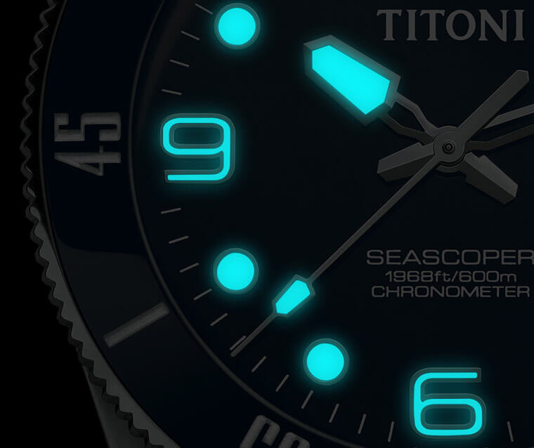 Seascoper 600米深潛系列面盤就像其他潛水錶般追求易讀、清晰與不花俏的風格,手錶的6點、9點與12點方向為阿拉伯數字時標,3點方向以日期窗取代時標,至於其他方位則是以圓點時標顯示。除了時標之外,包括錶圈12點方向倒三角標記內的圓點以及指針上頭都填有Super-LumiNova夜光物料,在黑暗環境下會發出水藍光芒,這點當你置身於日常不足的水下環境將特別受用。