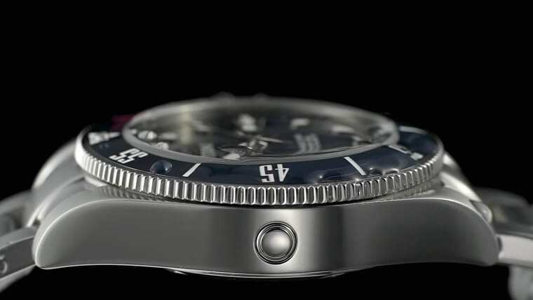 ▲錶殼左側設有專業潛水錶不可缺少的排氦閥裝置。