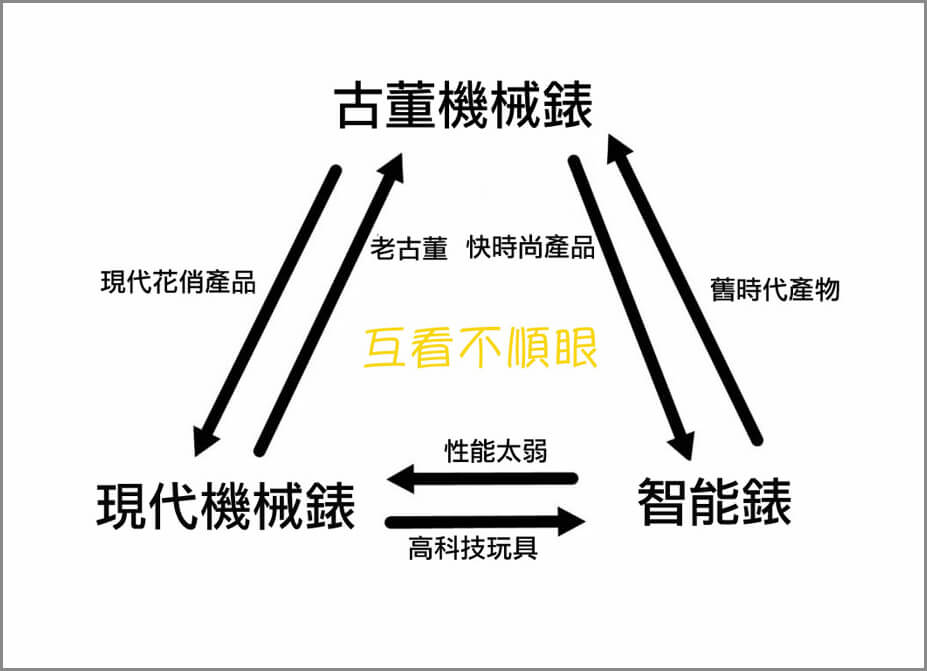 該錶友首先畫出了不同手錶類型的關係分析,包括有古董機械錶、現代機械錶和智能錶三大類型(石英錶他倒沒有列入其中),根據這三種類型對彼此的看法,錶友點出了他觀察到的情況如下: