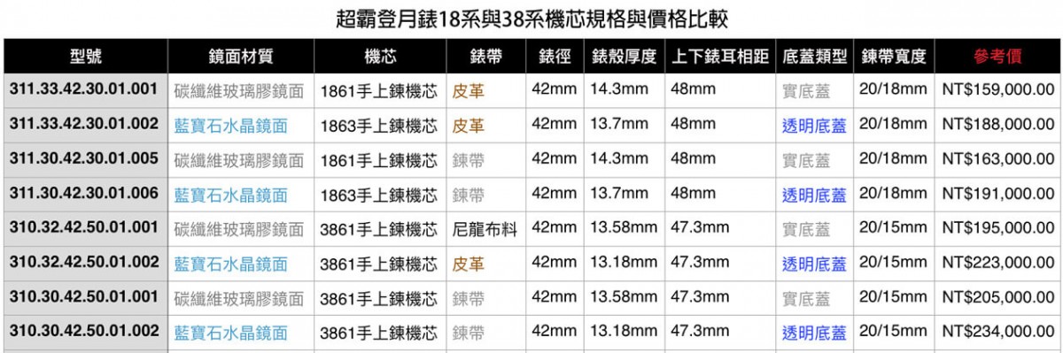 從表格中可以看出,以前入手18系機芯的不鏽鋼登月錶定價都在台幣20萬以內,最陽春的碳纖維玻璃搭1861機芯與皮帶款價格則是約16萬左右;改款後搭載3861機芯的不鏽鋼登月錶最入門款的定價已經超過上一代價格最高的一款,等於換上3861機芯後,不鏽鋼登月錶的價格整個往上提升了一階,漲幅約18%。