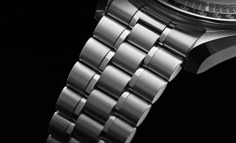 ▲新款登月錶的金屬鍊帶設計經過微調,除了個別鍊節的寬度有調整,其依舊採用拋光與磨砂交錯的加工賦予鍊帶更迷人的視覺層次。