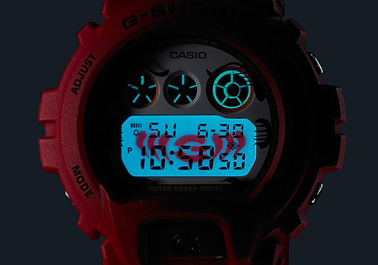 其中DW-5600DA的面盤周圍彷如達摩臉龐的延伸,包括眉毛與身上的線條都出現在面盤周圍,至於達摩臉部的眼睛、鬍鬚等細節則是在佩戴者開啟手錶背光照明時會浮現在面盤上。而DW-6900DA由於具有三眼數位小錶盤設計,因此G-SHOCK直接將三眼小錶盤比擬為達摩的眼睛與鼻子等感官,所以這款錶的面盤周圍乃是白色,象徵達摩的臉龐,而當手錶開啟背光照明時,下方的液晶顯示螢幕會出現結合”G”字與鬍鬚的創意圖案,與DW-5600DA同樣構成具有面盤延伸畫面的作用。