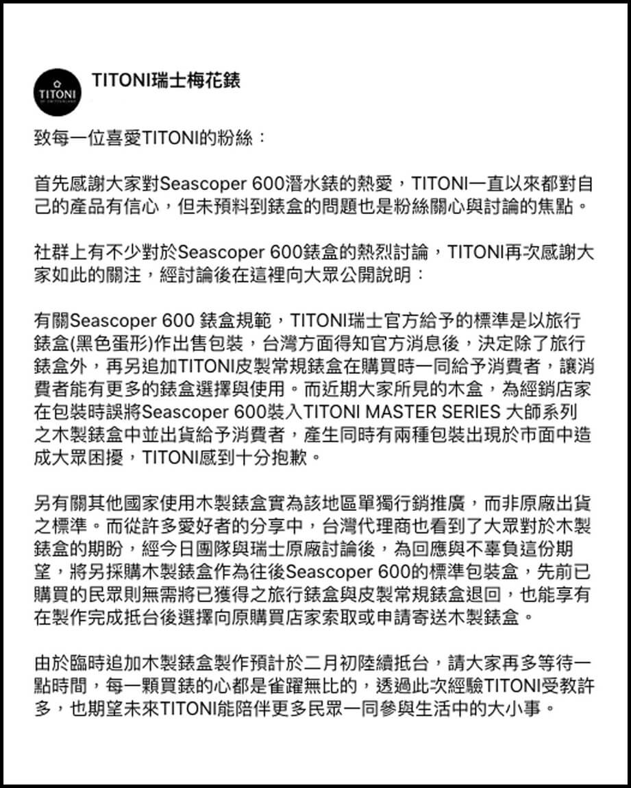 近來錶友討論度很高的TITONI梅花錶潛水錶新款Seascoper 600M自從上市以來因為規格不俗(如天文台認證、自製機芯、透明底蓋以及600米防水等),而且價格又漂亮(定價介於5~6萬台幣,有錶友分享折扣下來以3萬多的價碼入手)所以成為不少錶友鎖定的目標,最近在愛錶咖社團上也陸續有錶友Po出自己的開箱文,本來入手一款自己喜歡的錶當然是好事,但是卻也因為手錶愈來愈受到矚目而爆出所謂的「錶盒門」事件,這讓部分已經入手Seascoper 600M的錶友感到黑人問號、納悶,甚至有點小不開心,由於陸續收到錶友們的反映,因此梅花錶台灣代理商稍早也做出了回應,讓已經入手手錶的錶主們可以得到一個滿意的答覆。