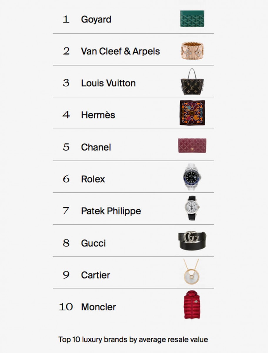 ▲The RealReal統計2020年轉售價值最高的十大奢侈品品牌排行。Source:The RealReal