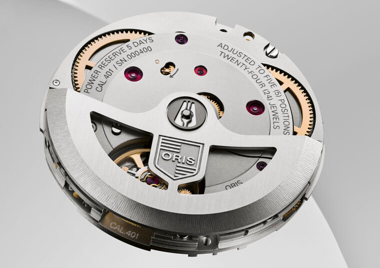 ORIS 2020年發表全新的自製機芯Cal.400,強調高抗磁性(抗磁力約為2,250高斯)、五日動力儲存、與10年保固等三大重點,有關這枚機芯的詳細特點在此不再詳述。至於Carl Brashear青銅限量錶搭載的Cal.401從名稱中不難看出它正是Cal.400的後繼機種,因此機芯的各式特性幾乎都完整保留,最主要差異則是從大三針日期變為移除日期的小三針顯示。比起前兩款Carl Brashear限量錶搭載改製而成的通用機芯,Cal.401的實用性與規格無疑有了長足的進步。