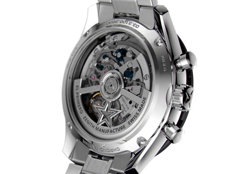 錶款搭載El Primero家族的新世代成員El Primero 3600,它雖然依舊維持5Hz震頻(擺輪擺盪36,000次/小時),但是真力時經過50年以上製作高震頻經驗的累積,得以把El Primero 3600機芯的計時精準度提高到1/10秒,同時動力儲存也擴展至60小時,藉由透明底蓋可以一窺機芯的精緻結構與打磨,其中品牌特地將操控計時功能的關鍵機制——導柱輪鍍上藍色,讓人一眼就能看到這個傳統工藝設計,同時鏤空自動盤也結合品牌的五角星標誌,辨識度自然不在話下。