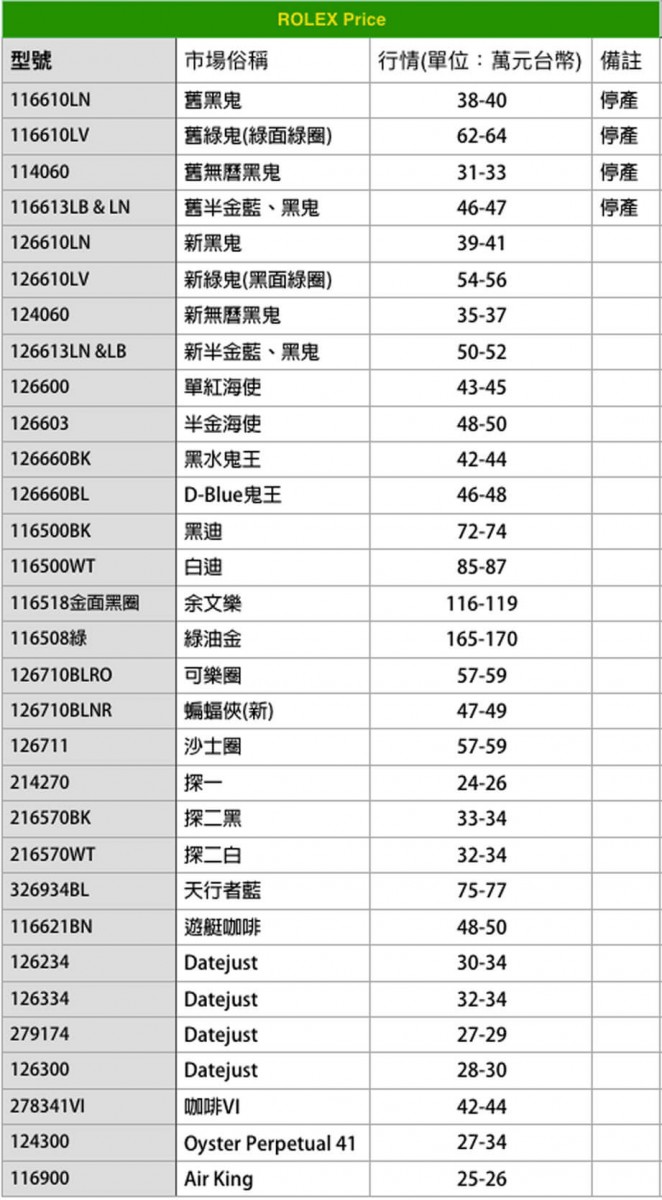 從以上市場最新價格來看,過完2021年第一個完整的月份後,勞力士熱門錶比起2020年12月的行情還是有些許變化,目前熱門款中的熱門款如綠水鬼、鋼迪和百事圈等基本上價格還是有再向上衝高的跡象,不過也有一些款式如舊款黑水鬼、半金海使等價格反而比起去年底要稍微跌了一些,若想了解更多去年底勞力士熱門錶的價格行情,不妨可以回顧《勞力士熱門款12月最新行情(附價格表)》所列出的報價資訊進行對照比較。
