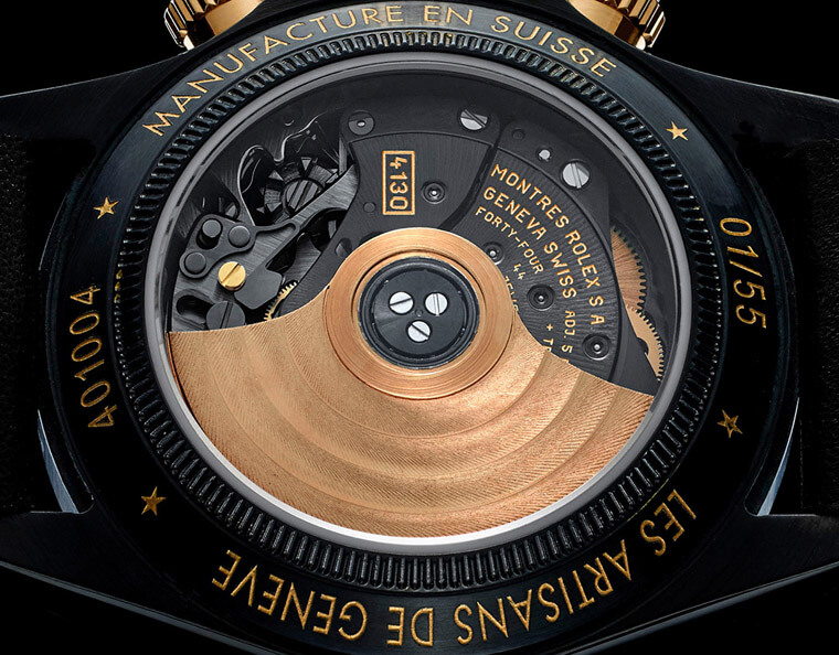 既然都拿去改裝,手錶底蓋如果還維持實底蓋設計不免會有點少了些什麼的感覺,對此Artisans de Genève很「識相」地替手錶換上了透明底蓋,而底蓋的4130機芯更是讓人驚豔,原來改裝品牌把機芯的零件全部鍍黑,另外幫機芯換上22K金自動盤,不過自動盤上除了施以環形日內瓦波紋之外,僅在自動盤外緣陽刻Artisans de Genève品牌名稱,這方面倒是顯得相對保守一些,不過以Lenny Kravitz對於復古風格的偏好來看,不要做太多花俏的設計或許正合他意。
