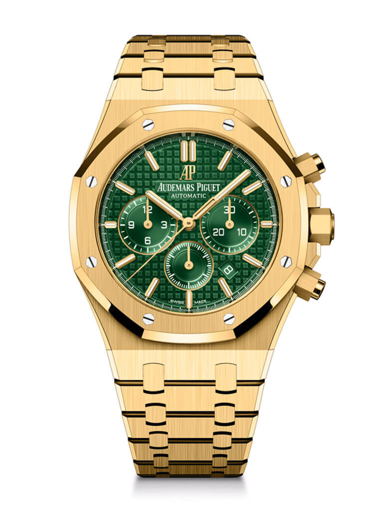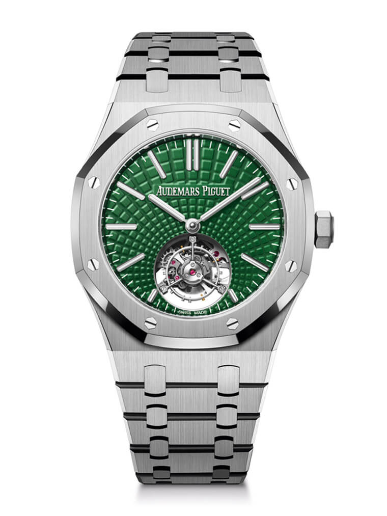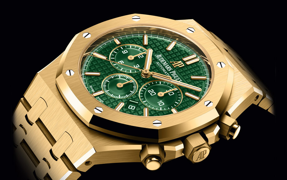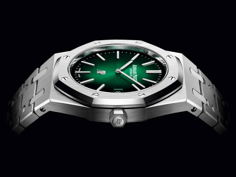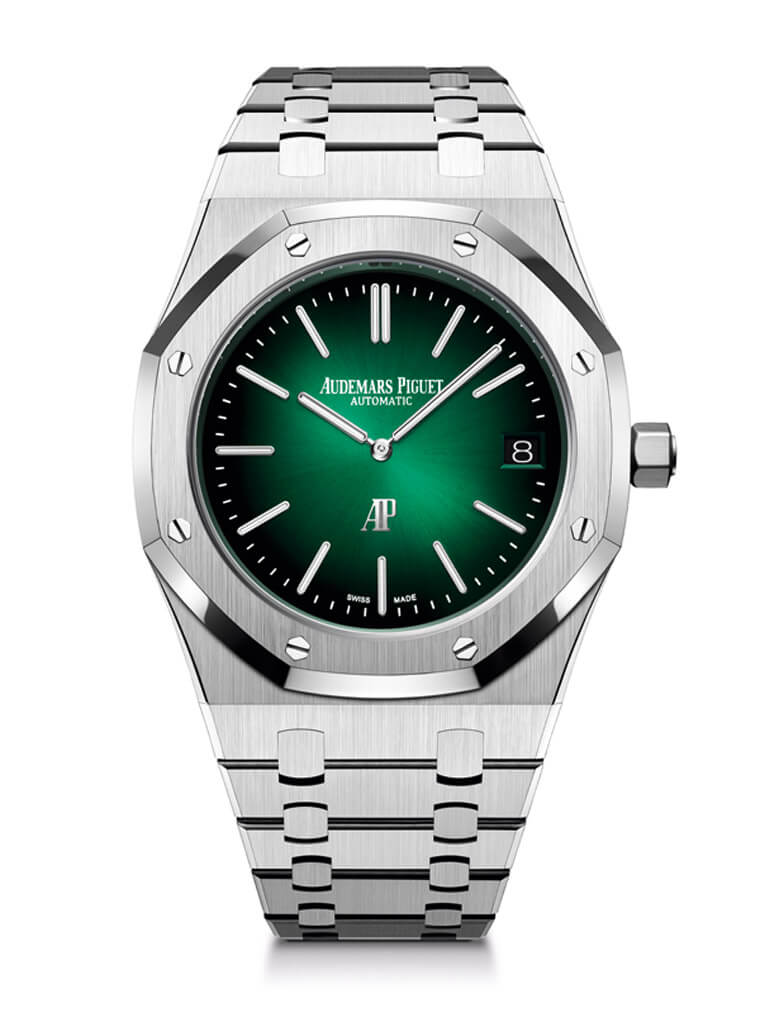 想到AUDEMARS PIGUET愛彼的皇家橡樹系列,大家最有印象的顏色應該就是藍色了吧,主要因為AP在1972年首度發表Royal Oak不鏽鋼運動錶時,便是採用藍面設計讓它深植在人們的印象中。發展到現代後,皇家橡樹系列的面盤顏色比起當年已經豐富許多,基本的黑、白、灰面不說,還包括紫色、天藍色、雙色、鏤空、漸層、雙色等等,品牌最近又再為這份色彩清單多添一筆綠色,一口氣發表數款採用綠面的皇家橡樹手錶。