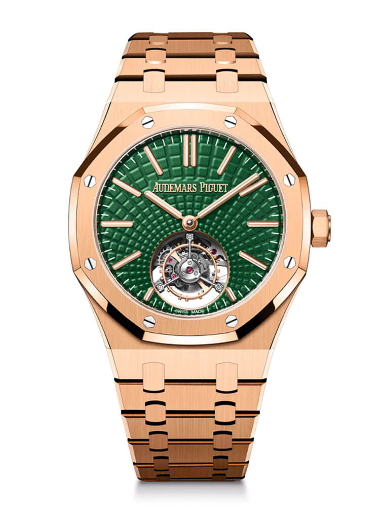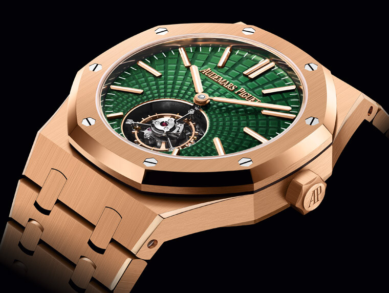 ▲玫瑰金款皇家橡樹飛行陀飛輪既高貴而面盤上的綠色又很吸睛,加上飛行陀飛輪運轉動態,讓人看得目不轉睛。