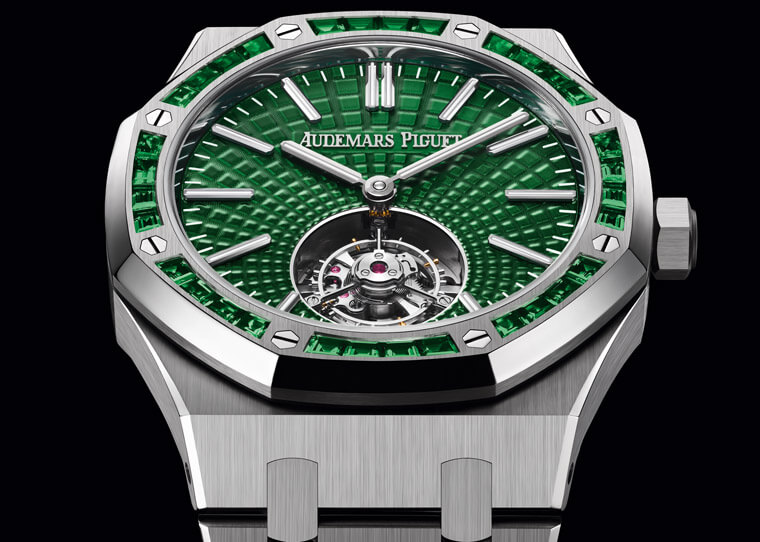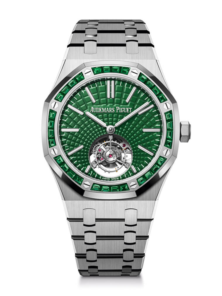 ▲綠面的皇家橡樹飛行陀飛輪鈦金屬款有一個版本為錶圈鑲嵌祖母綠的設計,視覺效果相對又更搶眼。