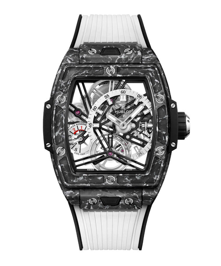 白色碳纖維材質/HUB6020手動上鍊機芯/偏心時、偏心分顯示/陀飛輪裝置/動力儲存顯示/藍寶石水晶鏡面、透明底蓋/防水30米/錶徑42mm/限量100只/參考價:NT$ 2,943,000