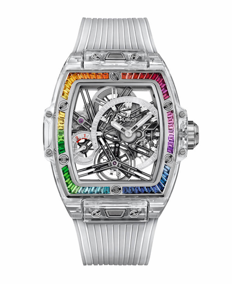 另款藍寶石錶殼版本則是將透明結合彩虹的概念,宇舶先以四塊藍寶石製成手錶的上層結構(含錶圈)、末端兩個上蓋、錶背下層結構,且由於Spirit of Big Bang系列是比較少見的酒桶型錶殼,所以它的製作過程需啟用特殊工具以及有別於圓形錶殼的製程才能完成。而除了錶殼不易製作外,宇舶也還在錶圈上的金材質部分鑲上54顆梯形切割多彩寶石,使得通透感十足的手錶因為融入彩虹圈而更富有欣賞價值。錶款搭載的HUB6020為品牌專為酒桶型打造的作品,它的陀飛輪裝置設在6點方向,至於時、分顯示則是偏心於接近面盤右側,另外8點方向還有動力儲存顯示可以了解手錶5日動力的消長情況,加上鏤空處理盡展透明錶殼之美,放眼錶壇很少能找到相似設計的複雜機芯,從中突顯了宇舶的創意與工藝水準。