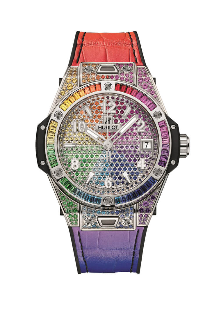 以精鋼製成錶徑為39mm的Big Bang One Click彩虹寶石手錶寶石數量比起計時款式有過之而無不及,總計它的錶殼鑲有118顆彩寶、18K金錶圈上有48顆梯形切割彩色寶石,面盤部分就更吸睛了,共有307顆彩寶鑲嵌覆蓋在上頭,使得僅僅具有三針加上日期顯示的基本功能看起來依舊精彩迷人,而它搭載的HUB1710機芯可以輸出50小時動能,兼顧了日常佩戴實用性。