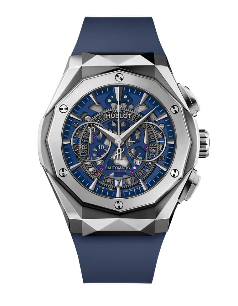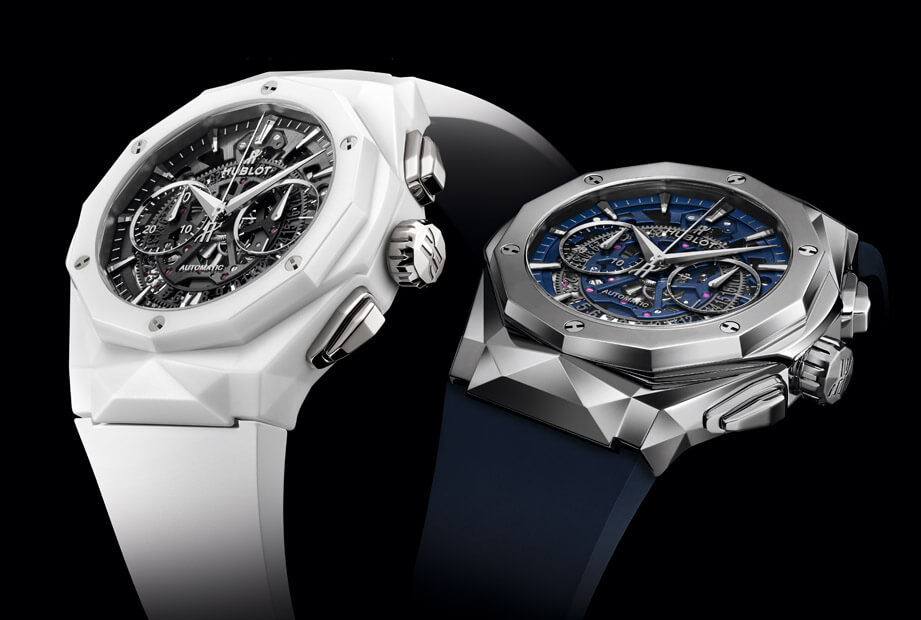 宇舶與品牌大使、藝術家Richard Orlinski合作推出的聯名款Classic Fusion Aerofusion Chronograph Orlinski 2021年再度改款,分別換上皇金、白色陶瓷以及鈦金屬材質,詮釋其獨具藝術美感的多切面立體錶殼造型。錶款結合Orlinski創作時的風格,包括錶殼、錶冠、錶圈以及按把都帶有立體切面,其中錶圈上的12邊角剛好可以呼應面盤上的12枚時標,展現品牌的巧思。此外手錶在製程上必須先進行建模再切割不同材質的錶殼,尤其陶瓷材質的硬度高,要打造出Orlinski聯名錶的外型相對難度也會提升,不過最終成品顯然相當令人驚豔。Classic Fusion Aerofusion Chronograph Orlinski鈦金屬款和皇金款紛紛採用藍色橡膠錶帶,不過白陶瓷款為了呼應錶殼顏色,宇舶也額外搭配白色錶帶,塑造出潔淨無瑕的外觀印象,與面盤開面設計露出精密機芯零件的格局形成強烈對比。