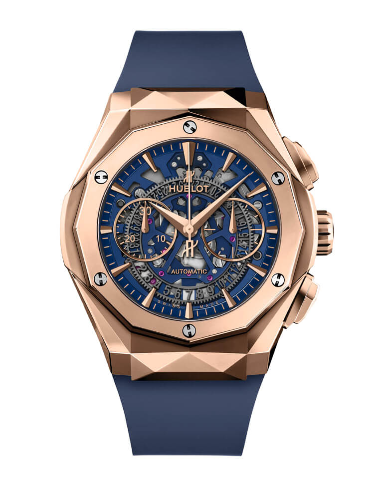 18K皇金材質/HUB11555自動上鍊機芯/時、分、小秒、日期顯示/計時碼錶功能/藍寶石水晶鏡面、透明底蓋/防水50米/錶徑45mm/限量200只/參考價:NT$ 1,174,000