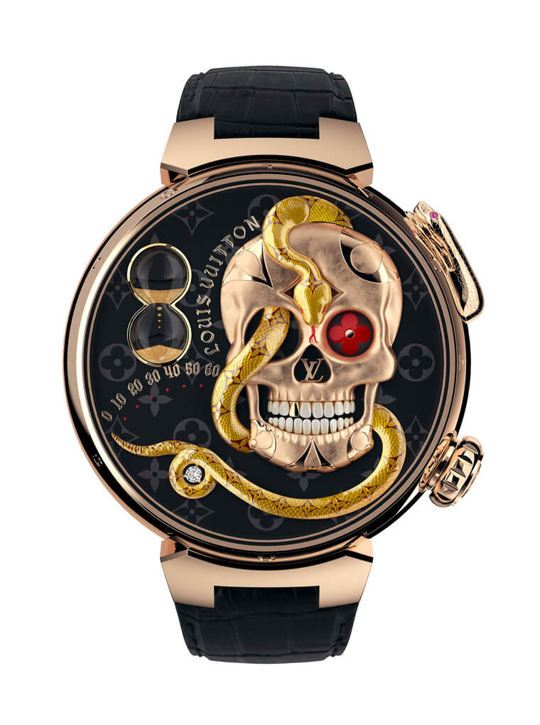 原來路易威登想藉由這款作品強調手錶報時的目的在於佩戴者需求,而並非因為手錶設有指針、視窗等顯示資訊而被動接受,所以這是一款需要佩戴者主動去啟動機關則會顯示時間的特殊手錶。在瞭解手錶的顯時功能之前,先好好欣賞Tambour Carpe Diem蘊含的裝飾藝術工藝之美,路易威登邀請琺瑯大師Anita Porchet和雕刻大師Dick Steenman共同操刀製作手錶面盤上的細節。Dick Steenman以手工雕刻出錶殼上的響尾蛇、面盤上的骷髏頭(含牙齒、沙漏以及另一條蛇),接著Anita Porchet則是以她出神入化的微繪技巧,細心繪製出面盤上的Monogram花紋以及纏繞骷髏頭金蛇身上的紋路,並幫骷髏頭左眼中的Monogram花紋以及骷髏頭的牙齒繪上生動的顏色。此外在面盤7點方向還會注意到金蛇尾段盤踞一顆圓形切割鑽石,透過以上兩位大師以及鑽石的點綴,造就出面盤上極盡搶眼之能事的畫面。