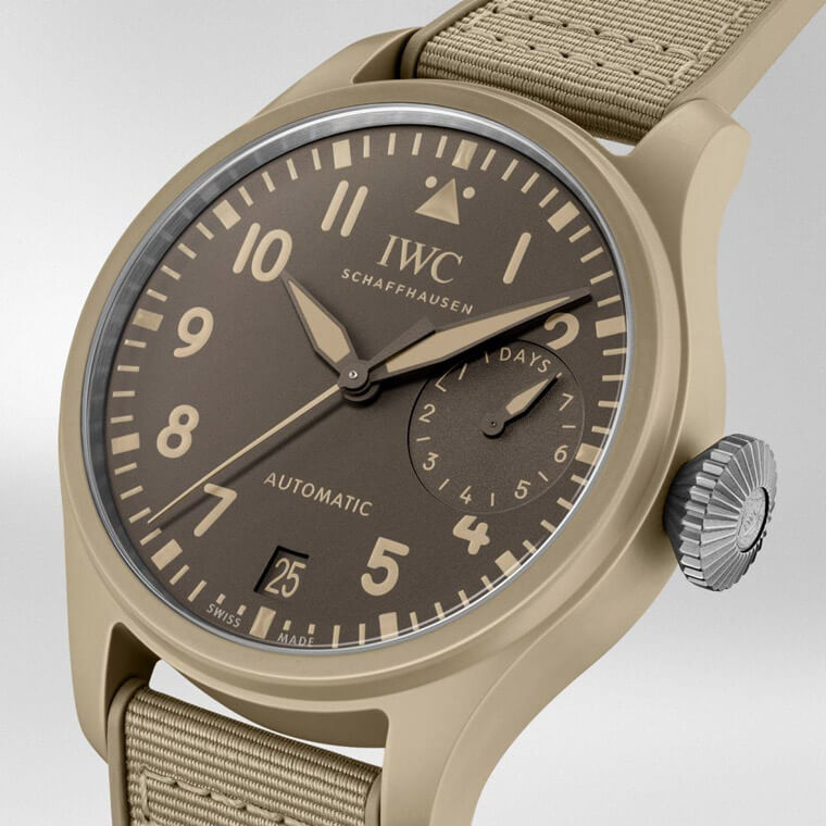 ▲繼Top Gun計時碼錶後,2021年IWC再度將沙色陶瓷導入大飛手錶上,少見的大地色系陶瓷殼搭配深棕色漸層面盤看起來相當舒適自在。