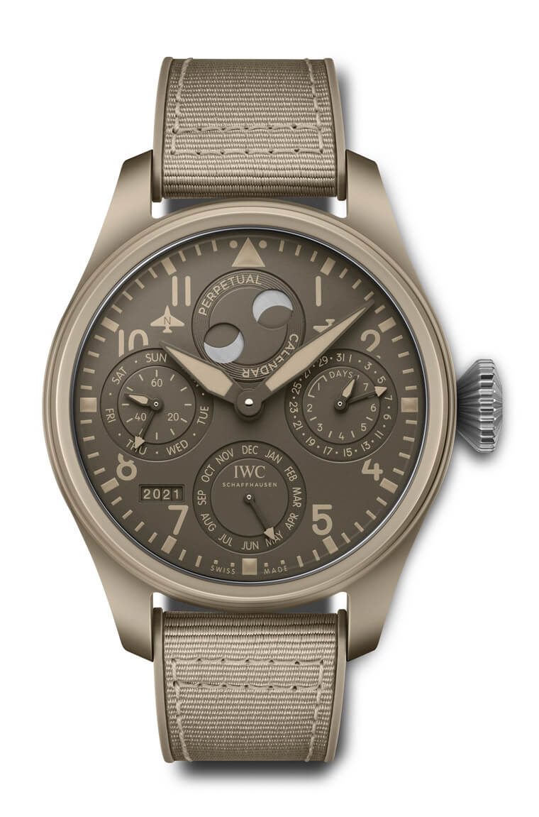 IWC萬國錶的飛行員系列是品牌展現錶殼材質研發成果的大平台,包括陶瓷、青銅、瓷化鈦金屬等等,其中Top Gun又是屬於一種陶瓷殼定番的子系列。IWC的陶瓷手錶過往都是以黑色為主,直到前兩年品牌別開生面於Top Gun系列的計時碼錶推出所謂的「莫哈韋沙漠特別版」,簡單來說那是一款採用沙色(或說是卡其色)陶瓷殼的作品,在Top Gun系列一片黑色陶瓷殼大軍之中,沙色陶瓷感覺特別顯眼。2021年IWC再度將沙色陶瓷應用在飛行員系列上,而且是品牌第一次推出啟用沙色陶瓷殼的大飛作品,除了基本的三針款(IW506003)之外,也還有另一款具備萬年曆功能的沙色陶瓷大飛(IW503004)同步登場,讓人感受到不同以往的大飛風格。