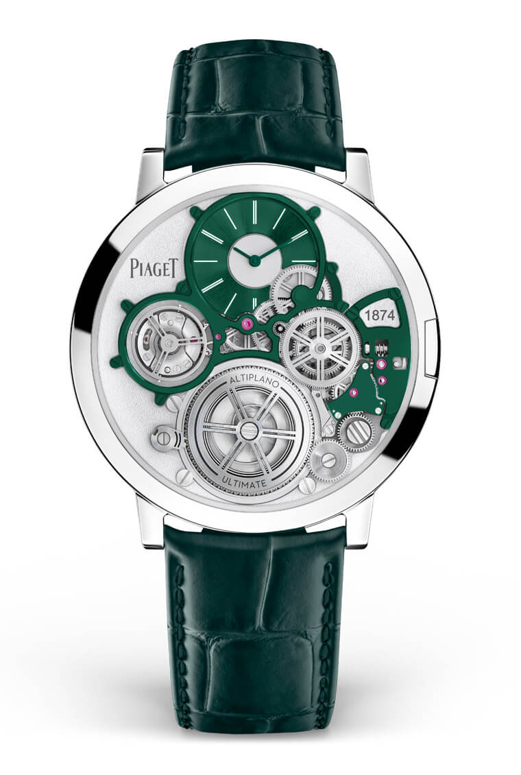 伯爵寫下錶壇最薄手錶紀錄的Altiplano終極概念錶推出特別版,用意是向自家歷史致敬,因此新款採用綠色零件這與品牌製錶發跡地——瑞士汝拉地區的仙子坡有關,這個地方每到春夏兩季時,該地區遍佈的草地和樹林青翠綠色總是讓到訪伯爵錶廠的人印象深刻,正是為了要傳達這樣的在地印象,品牌才決定將手錶的部分橋板、螺絲、偏心錶盤和指針鍍上墨綠色(還有錶帶也是同色系),因此伯爵並非跟流行選用這幾年市場很熱門的綠色,而是他們有自己的設計靈感,結果換成綠色的Altiplano Ultimate Concept特別版看起來完全無違和,甚至還有一種更搶眼的感覺。