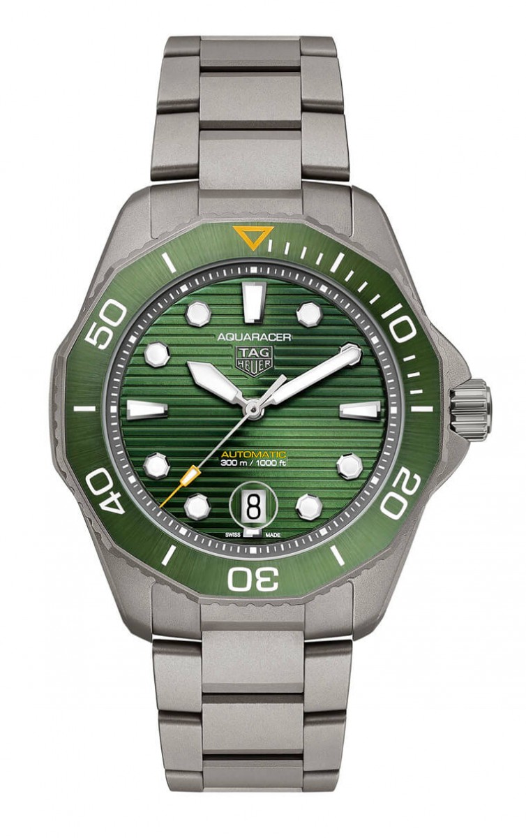 距離Aquaracer最近一次大改款已經過了差不多6年時間,2021年泰格豪雅再度針對此系列進行改造工程,推出全新的Aquaracer Professional 300米潛水錶,新款大致保留系列演化至今的一些招牌特色,不過泰格豪雅也適度調整裡手錶外觀的細節,朝更堅固耐用、更舒適與更洗鍊的方向持續進化。其中43mm版本有一款相對獨特,因為品牌首波發表的幾乎都是不鏽鋼錶殼,只有它採用噴砂鈦金屬錶殼,並搭配綠色陶瓷圈與綠色面盤,從手錶日期窗位置、時標造型等細節可以一窺新舊款的差異。