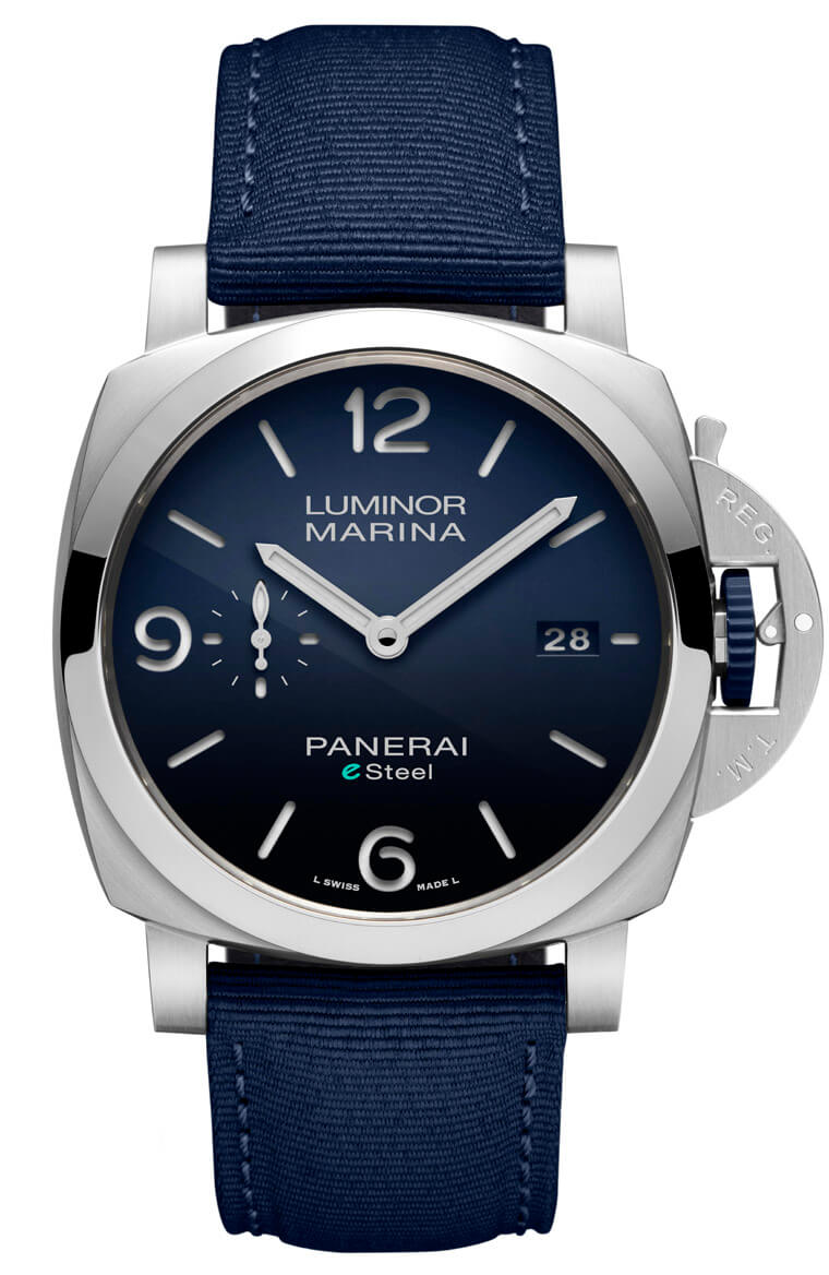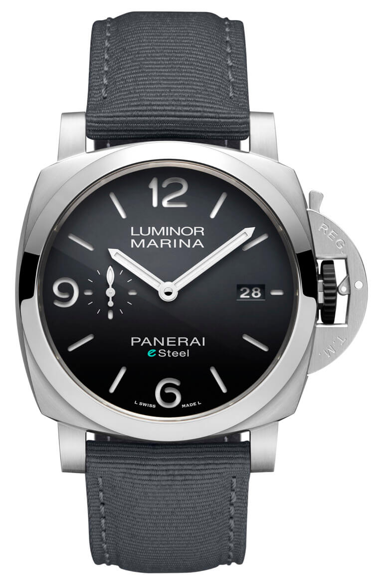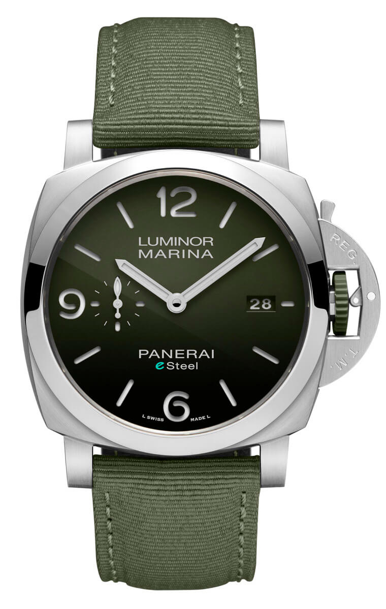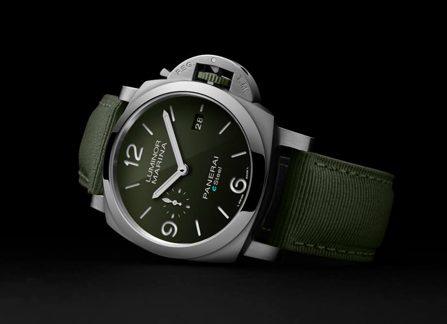 好在沛納海有許多合作夥伴提供充足的知識與技術,使得他們研發出的eSteel™材質不論化學特性、物理結構和耐腐蝕性等層面都能和傳統精鋼等量齊觀。Luminor Marina eSteel™一登場就分別有Verde Smeraldo墨綠色面盤(PAM01356)、Blu Profondo深藍色面盤(PAM01157)和Grigio Roccia岩灰色面盤(PAM01358)等三種款式,除了面盤顏色,它們都還搭配與面盤顏色呼應的織物錶帶,這種錶帶是以再造PET樹脂材質為基礎,連同梯形錶扣都還是以eSteel™材質製成,高比例的環保物料突顯手錶的核心主題。