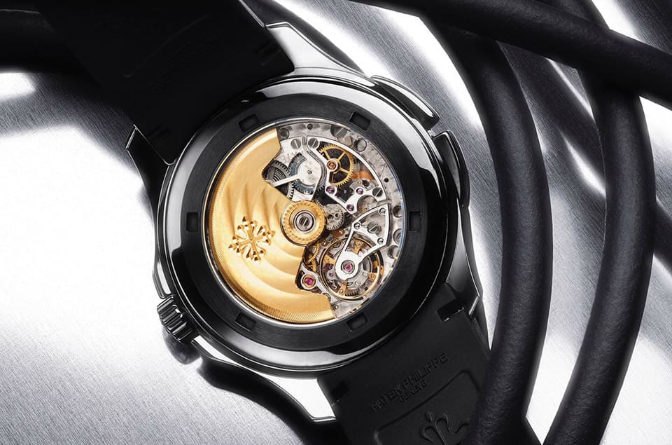 MAD Paris在大量捨棄面盤輔助顯時的元素之餘,還是保留下面盤外緣的刻度以及日期顯示盤周圍的刻度(不然真的很難看出明確的時間),此外由面盤刻度環-日夜顯示窗-日期顯示盤的範圍內也特別以鍍黑的鏤空橋板連接,這麼一來既可以維持日夜顯示的功能,同時又帶有一點裝飾效果,一石二鳥的設計盡顯MAD Paris的製錶才華。改成開面結構的Aquanaut 5164A老實說視讀性並沒有原廠設計出色,但如果是以獨特性的角度來論,錶主的確達成了他的願望,讓手錶看起來自成一格且能釋放高級製錶工藝的迷人本色。
