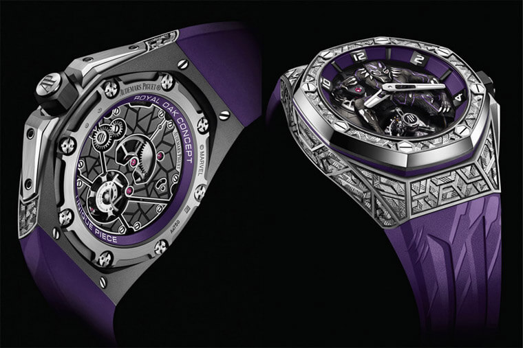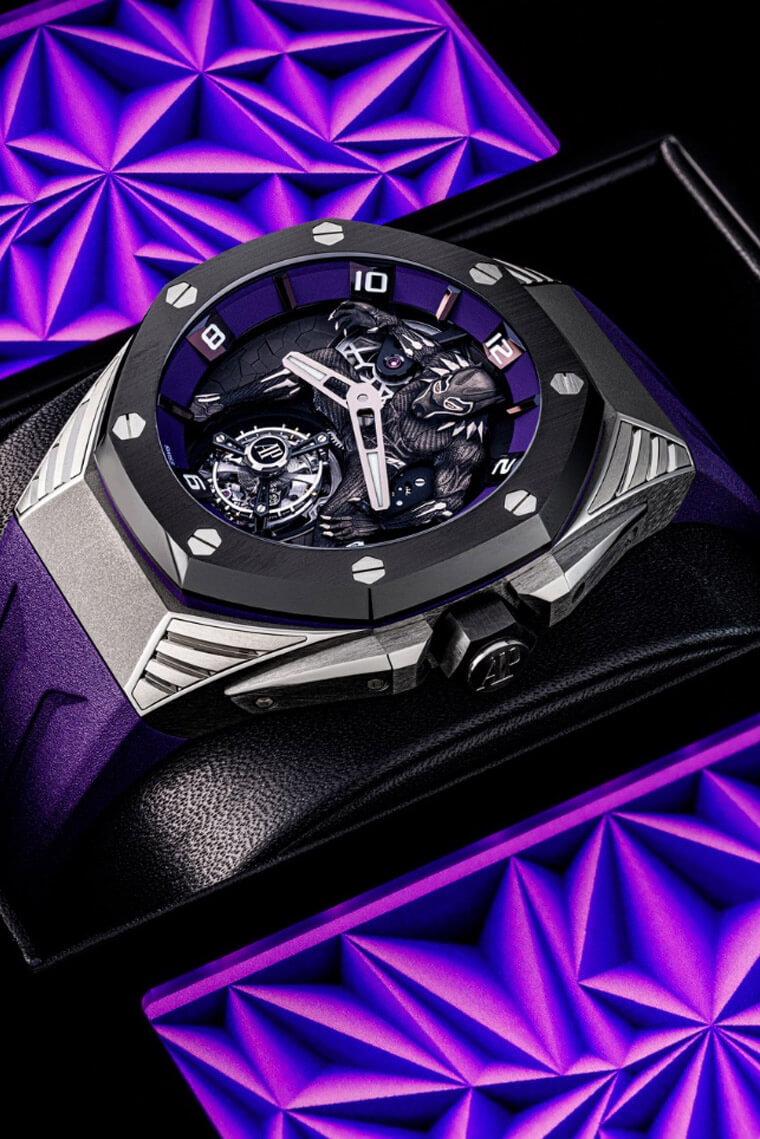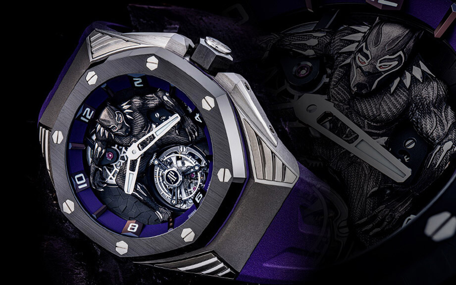 高級製錶品牌如AP過去本來便不常推出聯名款,更何況還是和漫威(Marvel)影業此這種影視娛樂公司旗下的超級英雄虛構角色結合,不僅開創品牌先例,也是高級品牌中相當難得的創舉。而且皇家橡樹概念系列「Black Panther黑豹」飛行陀飛輪並非只是簡單透過配色、刻字等小細節變化突顯聯名身份而已,它是整款錶直接且強烈地融入黑豹的印象,包括與黑豹劃上等號的黑色與紫色組合、錶耳上的豹爪抓痕、甚至在面盤上還直接鑲上白金打造的手繪3D立體黑豹微型金雕,加上用來點綴面盤和錶背機芯底板的不規則裂紋等,以上種種刻畫入微的細節都讓這款愛彼陀飛輪富有賞玩的逸趣。