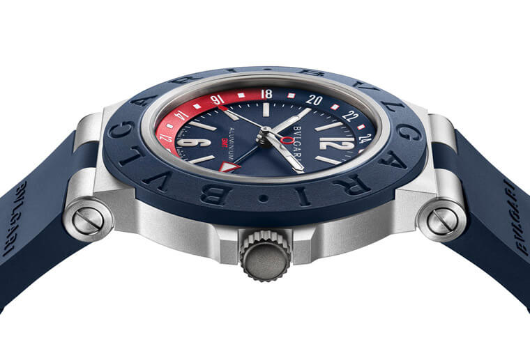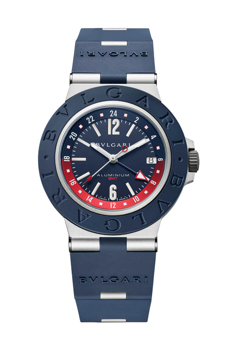 Aluminium GMT按照系列慣例採用鋁合金錶殼搭配橡膠錶圈和錶帶,錶徑也固定在40mm,與三針和計時款一致,不過這款稍微有點不同之處在於它的鈦金屬錶冠外圍並沒有包覆與錶圈同色的橡膠,至於手錶的深藍色橡膠錶圈和錶帶倒是有點讓人想起寶格麗與三色箭飛行表演隊合作的聯名款。