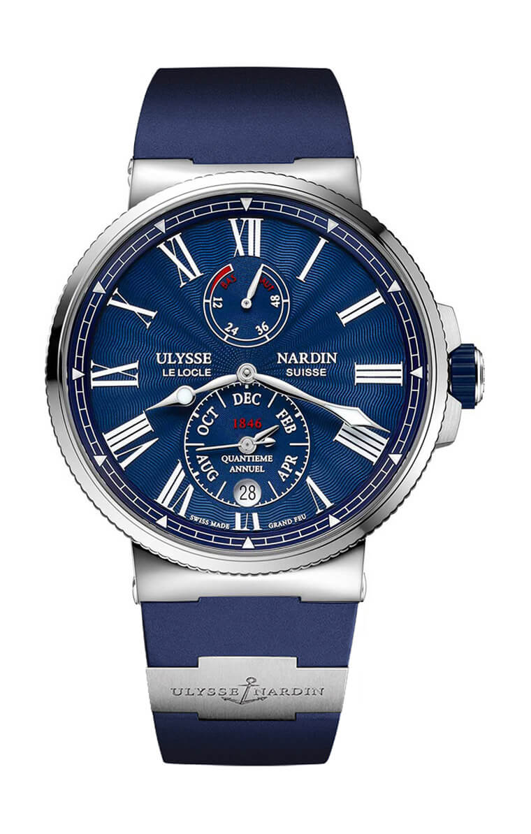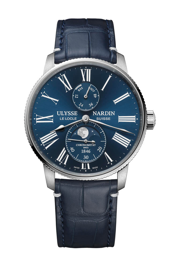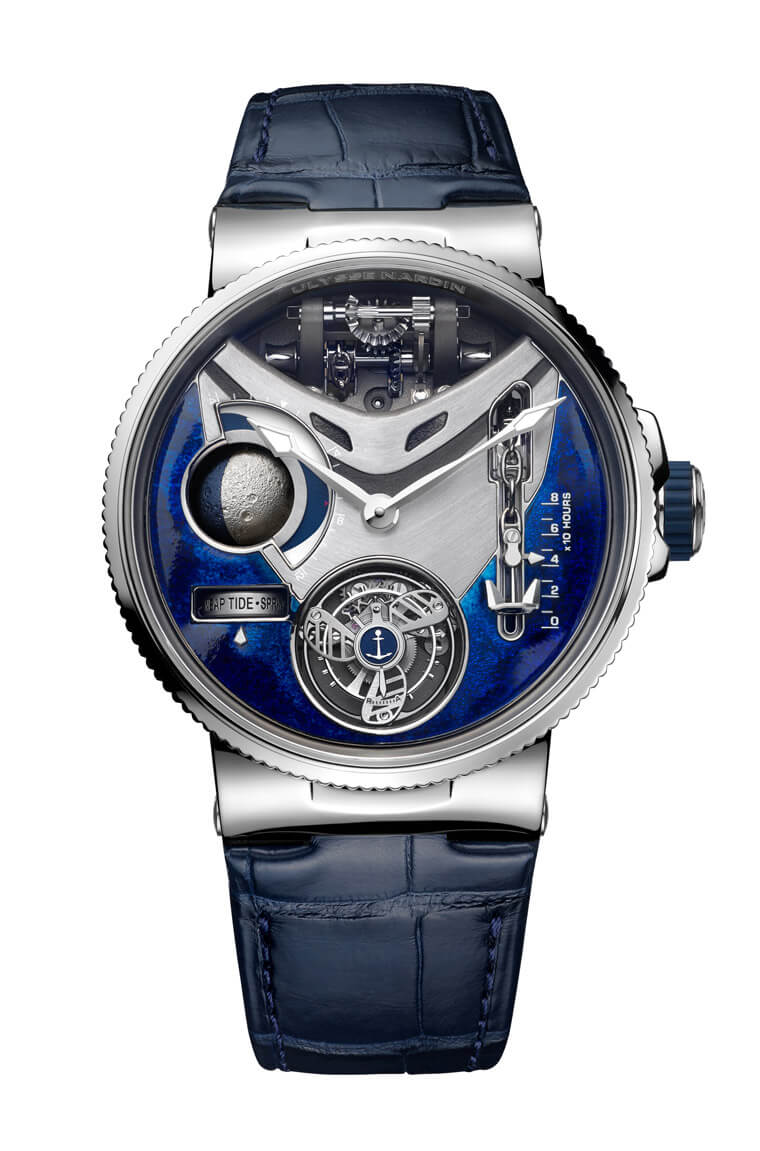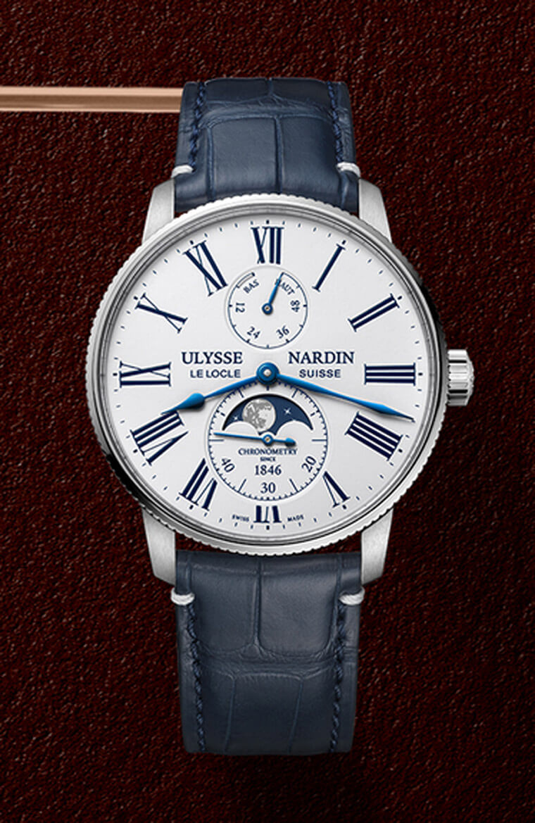 錶款採用藍色或白色面盤,特點在於面盤6點方向的月相功能,其為製作天文儀器的核心功能,因為月相牽動著潮汐變化,而潮汐對航海活動影響巨大,因此錶款的月相不只是視覺上賞心悅目而已,還有針對航海用途的錶主提供辨識潮汐起伏的實質功效。細看手錶的月相盤,會發現它的月相圖案特別做出月球表面的陰影,搭配周遭的星星圖案,展現活靈活現的擬真度。錶款各限量300只。參考價:NT$ 311,000