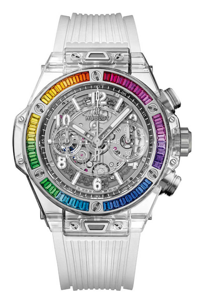 藍寶石水晶材質/HUB 1280自動上鍊機芯/時、分、小秒、日期顯示/計時碼錶功能/錶圈鑲嵌48顆長方形切割彩色寶石/藍寶石水晶鏡面、透明底蓋/防水50米/錶徑42mm/限量50只/參考價:NT$ 2,911,000