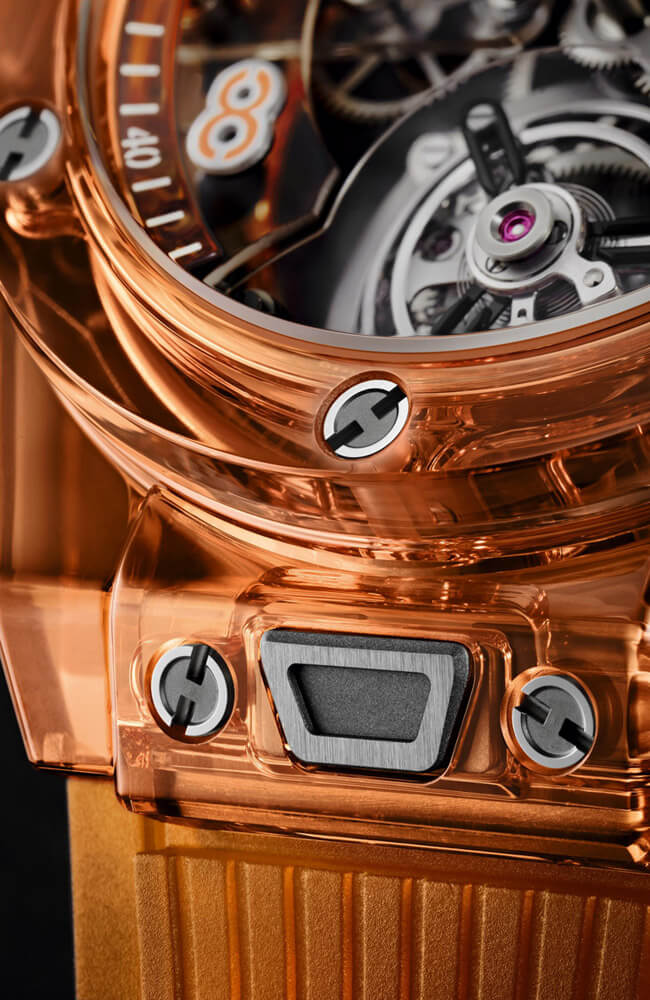 透明錶殼之所以高貴與它的加工難度有關,偏偏宇舶手錶的造型並不是以簡約樸實著稱,綜觀品牌所推出過的透明錶殼作品,從Big Bang、Spirit of Big Bang到MP系列應有盡有,就以品牌最招牌的大爆炸系列來說,它的圓形造型已經算是品牌最樸實的設計了,但此系列的錶殼乃是由三明治結構層層堆疊組成,等於藍寶石錶殼零件也需要跟著切割、分類得更細並再組裝起來,無形中提升了手錶的製作難度。