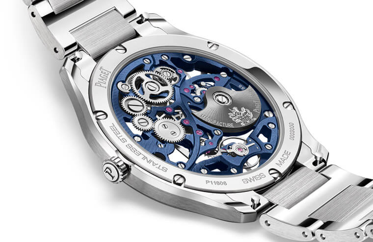 錶背透明底蓋露出伯爵為了此款所特別打造的1200S1鏤空機芯,PIAGET Polo三針款搭載的1110P機芯由於並不以強調超薄設計為主,但是1200S1則重新找回伯爵製錶的超薄靈魂,其裝載進錶殼後整體厚度為6.5mm,足足比三針款的PIAGET Polo要薄上30%左右,佩戴時的輕盈舒適感也躍居為目前系列中的佼佼者。
