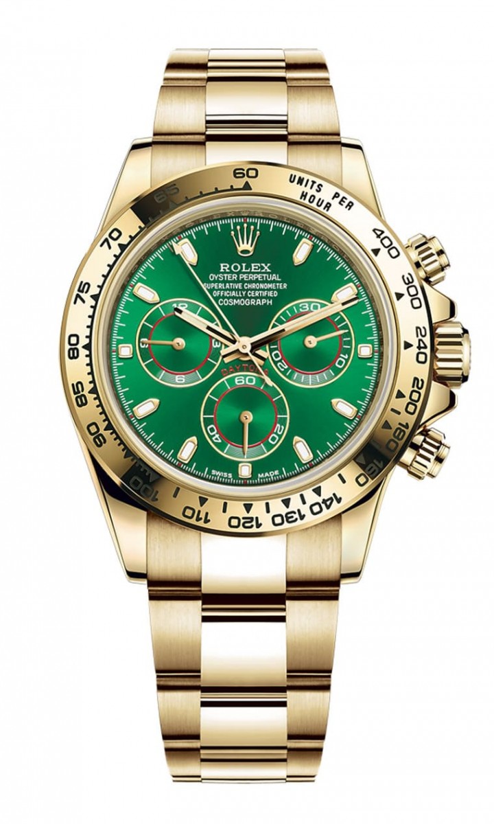 此型號中最受市場喜愛的是綠面版本(也就是大家常聽到的綠金迪),但其實同個型號共有多達8種不同顏色的面盤;有意思的是,有時光只是面盤顏色的差異,就能決定手錶行情的起伏,例如黑面的116508現在要價約53,000美金以上,但綠金迪的行情遠不止這樣,想要入手少說要花到77,000美金。