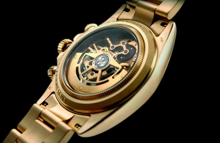針對錶背部分,這家改裝錶品牌向來喜歡幫勞力士手錶改成透背(這樣才能更完整展現出鏤空效果),因此我們會驚喜地發現手錶搭載的4130機芯簡直像是脫胎換骨一般,不僅零件經過鏤空處理,還有很多地方都改成了K金零件,像是自動盤就明顯可以看到它升級為K金材質,而SKELETON CONCEPT除了幫自動盤進行緞面打磨,也不免俗地要鏤空自動盤,讓人可以更清楚看見底下鏤空後立體感更強烈的機芯結構。