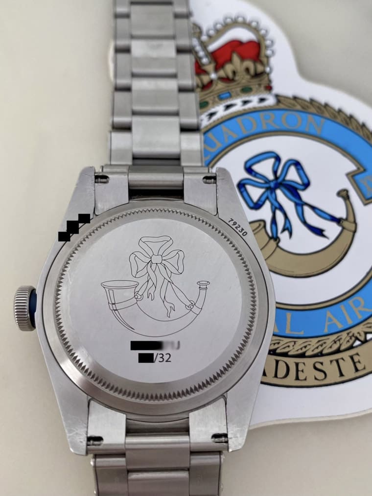 帝舵與第32(皇家)中隊合作生產的特別版手錶是以Black Bay 79230B為基礎無誤,剛好藍色錶圈可以呼應英國皇家空軍制服顏色,特別版與一般版主要的差異在於6點方向改以“32 (THE ROYAL) SQUADRON”字樣取代“200m:660ft”字樣,因此這款79230B的面盤字樣看起來面積範圍會比較大一些。另外翻到錶背也可以看到實底蓋刻上第32中隊的帶弦號角Logo,圖案下方會有兩排數字,上排數字代表購買這只錶的中隊成員兵役編號、下排數字則是手錶的限量編號(用限量數32來呼應第32中隊的編號)。