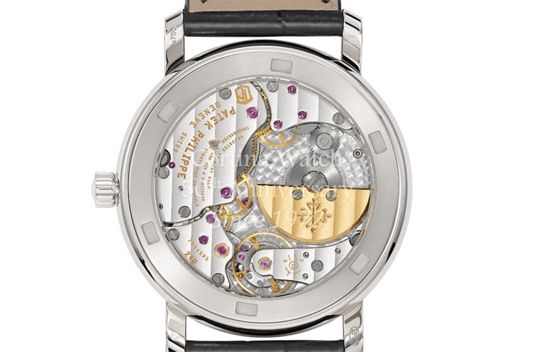 ▲Calatrava 5057G-010透明底蓋印有"Cortina Watch 50th Anniversary - Since 1972”字樣,可讓人一窺240 PS IRM C LU自動機芯的樣貌。
