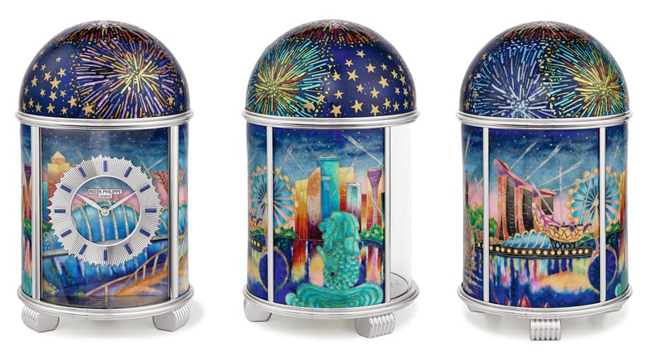 ▲PP另外打造一款20145M-001《新加坡天際線》座鐘,採用掐絲琺瑯呈現道地新加坡印象,這件作品專門供高登鐘錶收藏展示用,是絕無僅有的非賣品。