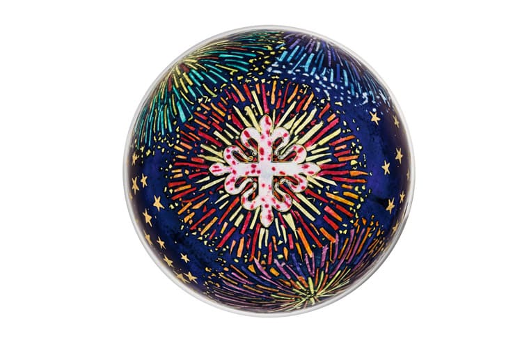 ▲20145M-001座鐘上的圓頂以繽紛琺瑯釉彩呈現煙火般的畫面,賦予象徵PP的卡勒卓華十字圖案絢麗視覺效果。