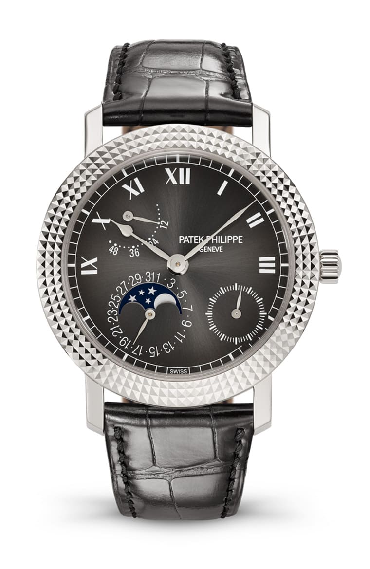 首先看到的是Calatrava 5057G-010手錶,有印象的人應該會記得百達翡麗曾在1997年為當時歡慶25歲生日的高登鐘錶創作過一款5057R-001紀念錶,因此2022年新增的Calatrava 5057G-010一方面傳承前作的設計精髓,同時也帶有慶祝高登鐘錶邁入新里程碑的意義。錶款的特色包括錶圈擁有三排手工機刻巴黎釘紋裝飾,同時其搭載的240 PS IRM C LU自動機芯呈現在面盤上也很有自己的風格,例如7點方向有日期月相盤、10~11點方向有動力儲存顯示,4點方向則有小秒盤等,以不對稱的排列詮釋多重功能組合。5057G-010面盤顏色換成了灰黑漸層,並帶有太陽放射紋,與白金錶殼、黑色鱷魚皮錶帶搭在一起散發較為摩登的印象。至於錶背可見透明底蓋微微印上有"Cortina Watch 50th Anniversary - Since 1972”,彰顯手錶慶祝高登鐘錶50週年的特殊意義。