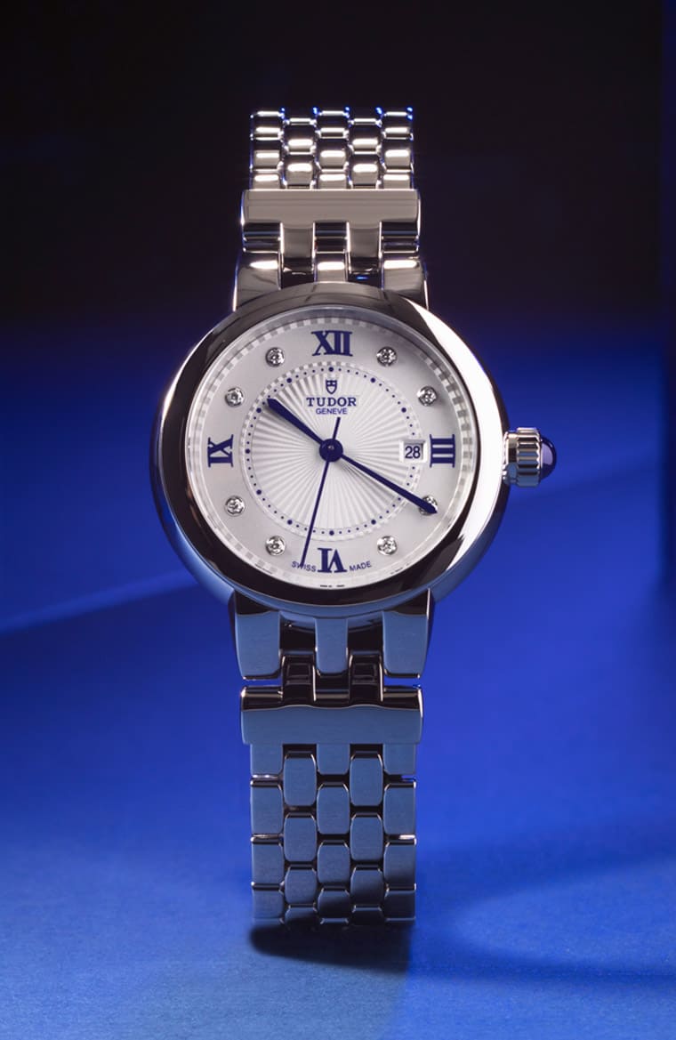 Clair de Rose系列僅以不鏽鋼製成,搭載機械機芯,帝舵分別提供三種尺寸及六款設計可供選擇。此系列秉承古典優雅及永恒經典的精神,不僅善用品牌歷史美學特色,亦保留了中層錶殼柔美的線條與大型錶冠設計——錶冠上鑲有一顆藍色圓拱形尖晶石,替手錶點綴吸睛元素。Clair de Rose錶殼直徑分別有26mm、30mm 及34mm等,另外銀色面盤款式飾有精美的浮雕圖案,以藍色漆面羅馬數字或鑽石作為時標,面盤3點方向設置日期窗,無論就造型風格或實用性而言都有吸引人的亮點。
