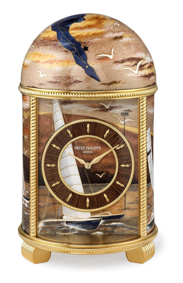 而在PP 2022珍稀工藝展正式登場前,品牌也先一步釋出了展覽中的焦點作品讓我們搶先一睹為快,例如品牌設有一個展櫃,裡面陳列的時計作品創作主題都是於百達翡麗的大本營——日內瓦有關。其中必看的展品例如一款20118M “Bol d’Or”圓頂座鐘,這款作品的靈感來自金球Bol d’Or帆船賽,由於品牌的榮譽主席Philippe Stern先生是這項賽事的狂熱者,他和他的愛船Altaïr曾經7度在這項比賽中獲獎,因此在欣賞這款座鐘時會發現鐘身上有一些年份數字,那就是Philippe Stern先生愛船得獎的年份,而鐘鼎部分的藍色琺瑯上也還會看到點綴其中的金色線條,那正代表著帆船比賽用的航線。