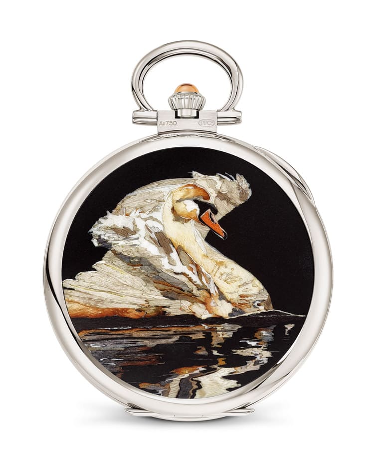 另款展覽中的亮點為995/130G-001「天鵝」,日內瓦湖常見天鵝在上面成群悠遊,所以看到天鵝自然也會想起日內瓦的著名景色,百達翡麗於懷錶的背面採用細木鑲嵌工藝點綴,工藝師在製作過程中總共使用23種不同顏色、材質乃至紋路的木材,而光是要呈現出懷錶背面天鵝於日內瓦湖上棲息的圖案,品牌就運用多達223枚的木片才能大功告成,圖案雖然僅以天鵝為主角,但是品牌的工藝師手藝細膩到連湖面上的天鵝倒影都做得栩栩如生,讓人看得歎為觀止。
