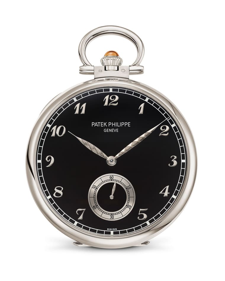 而在懷錶的正面部分,百達翡麗選用黑色琺瑯製作面盤,上面鑲有白金立體寶璣數字時標,包括指針都樣也是白金材質打造,細看時、分與秒針表面都另外帶有手工雕刻裝飾,精工細作的質感完全顯露在這些細節中。此外懷錶位於12點方向的錶冠也特地鑲嵌一顆約0.44克拉的凸圓形錳鋁榴石,橘黃色調似乎與天鵝圖案的部分顏色有關聯。而懷錶不僅可以隨身攜帶,PP也還額外附上一個白金支架,它的橢圓形底座以銀光黑曜石製成,底座表面也鑲有另一顆凸圓形錳鋁榴石,錶主在出門回家後便可以將懷錶固定在上頭,成為一個居家空間中的小型時鐘。